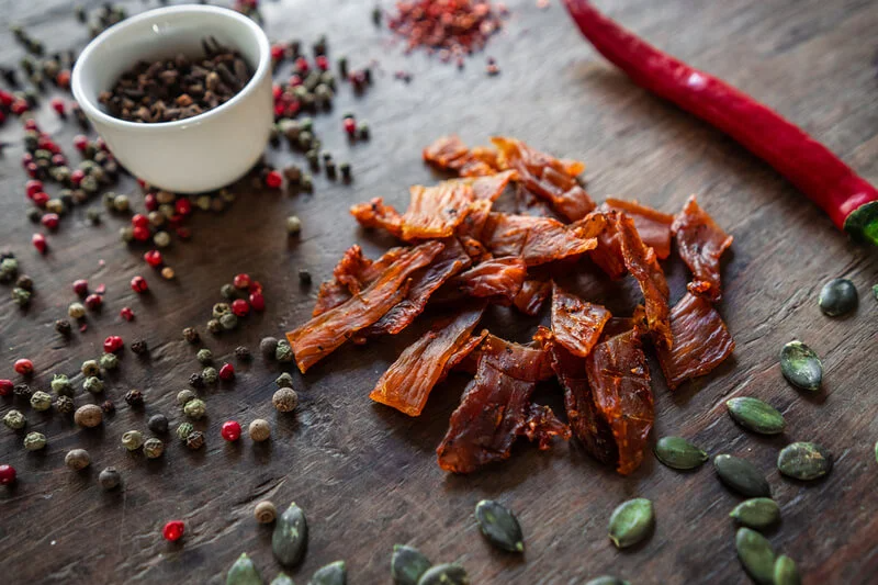 Мы готовим джерки из курицы, отбирая лучшее мясо и щедро приправляя его натуральными специями: чесноком, паприкой и дроблёным перцем для насыщенного, сбалансированного вкуса с приятной пикантностью. Далее следует этап обильного посола и сушки в специальных камерах со строго контролируемой температурой и уровнем влажности. Процесс занимает от 8 до 12 часов — за это время мясо теряет влагу, но концентрирует в себе все питательные вещества и яркий аромат специй.